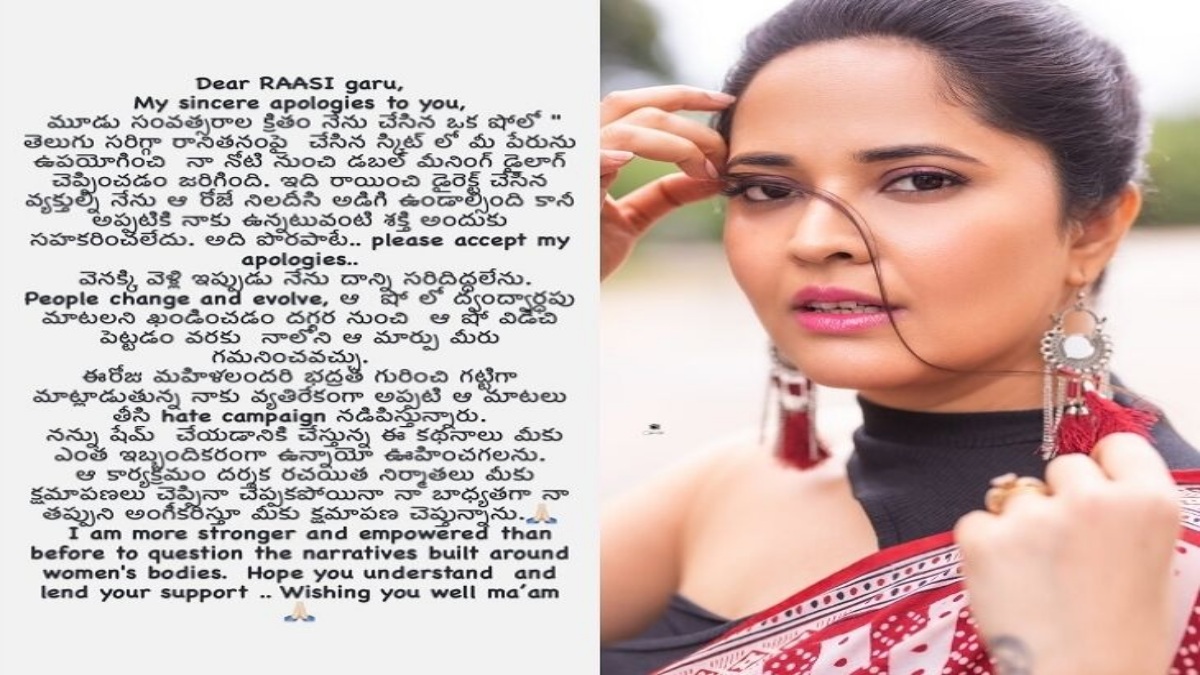 సీనియర్ నటి రాశికి క్షమాపణలు చెప్పారు అనసూయ. ఈమేరకు తన అధికారిక ఎక్స్ ఖాతా వేదికగా పోస్టు పెట్టారు. " డియర్ రాశి గారు.. మీకు నా క్షమాపణలు.. మూడేళ్ల క్రితం నేను చేసిన ఓ షోలో తెలుగు సరిగ్గా రానితనంపై చేసిన స్కిట్ లో మీ పేరును ఉపయోగించి నా నోటి నుంచి డబుల్ మీనింగ్ డైలాగ్ చెప్పించారు. ఇది రాయించి డైరెక్ట్ చేసిన వ్యక్తుల్ని నేను ఆ రోజే నిలదీసి అడిగి ఉండాల్సింది. కానీ నాకు అప్పుడు ఉన్నటువంటి శక్తి సరిపోలేదు. అది పొరపాటే.. ప్లీజ్ నా క్షమాపణలను స్వీకరించండి..