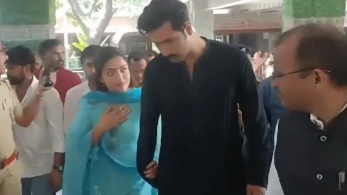 VIDEO | Actors Vicky Kaushal (@vickykaushal09) and Rashmika Mandanna (@iamRashmika) arrive at Sai Baba Temple, Shirdi to offer prayers ahead of release of their film 'Chhaava'.#Chhaava