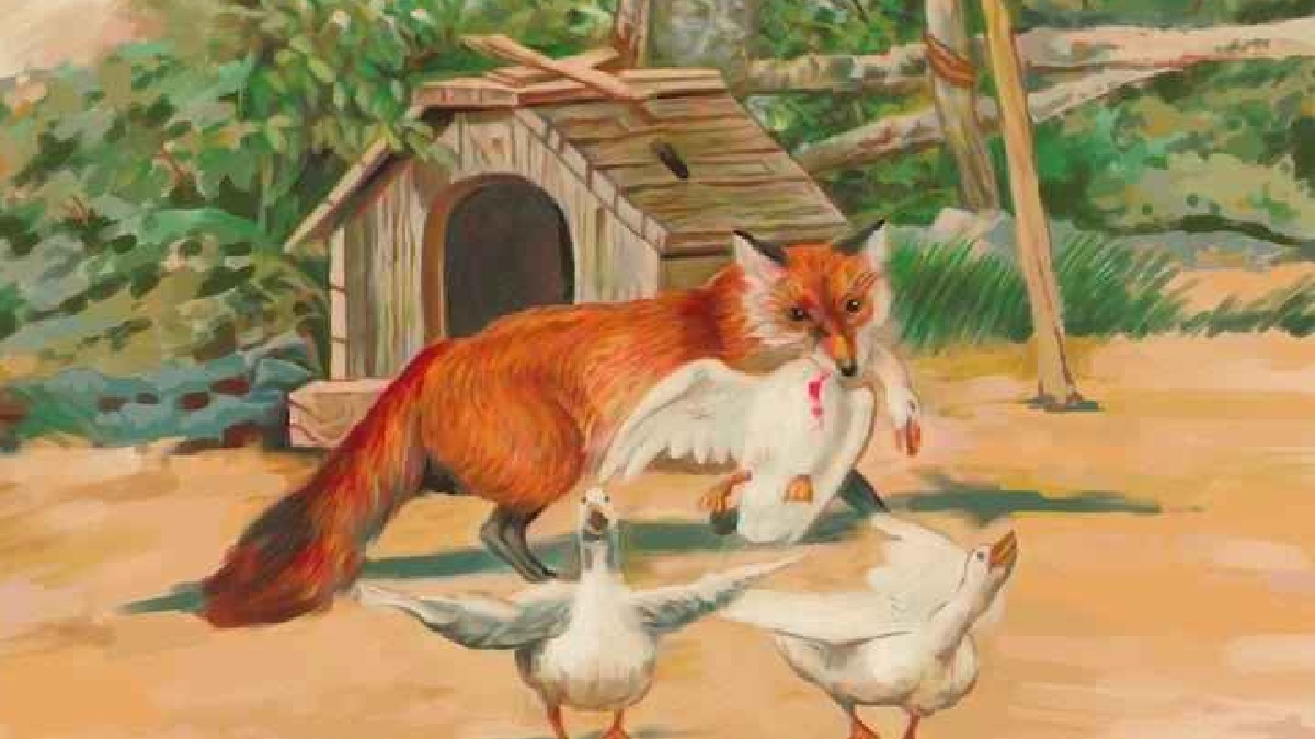 ఈ కనిపించే చిత్రంలో ఎర్రటి-నారింజ రంగు బొచ్చు, పొడవైన తోకతో ఒక నక్క కనిపిస్తుంది. అది తెల్లటి బాతును తన దవడల్లో పట్టుకుని పరుగెత్తుతోంది. దగ్గర్లోనే మరో రెండు బాతులు భయంతో ఆ దృశ్యాన్ని చూస్తున్నట్లు కనిపిస్తున్నాయి. మొత్తం దృశ్యం చాలా సహజంగా, స్పష్టంగా కనిపిస్తుంది. కానీ ఈ చిత్రంలో ఒక కుక్క దాగి ఉంది. కంటికి వెంటనే కనిపించకుండా, నేపథ్యంలోని రంగులు, ఆకారాలతో కలిసిపోయి ఉంది. మీకు వీలైతే ఆ కుక్కను గుర్తించడం.