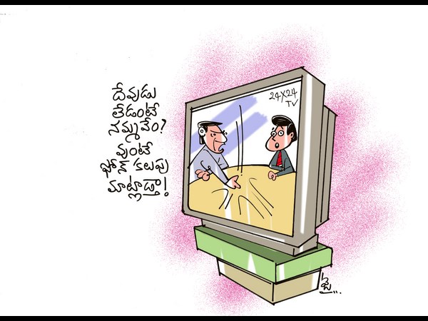 చూశారా ఎవరికి కనిపించాలో కూడదో కూడా తెలీనివాడు దేవుడా అని లాగి బల్లను కొట్టాడు ‘గాడ్'కి ఆగినిస్టుగాడు. అసలు ఉండాలి కదా కనపడ్డానికి అన్నాడింకో గొట్టంగాడు. చర్చ తారాస్థాయిని అందుకుంది. రాందాసు సందుచూసుకుని ‘గాయబ్' అయ్యాడు. మరో ఒకరిద్దరు దేవుడ్ని చూసినవాళ్లూ చూడని వాళ్లూ ఫోన్లో వూగులాడి వూడిపోయారు. లైన్లు కట్ అయ్యాయి. చర్చించుకునే వాళ్ల దగ్గర మాటలు అయిపోయేయి. చేతులు యాక్షన్లోకి దిగే సమయం వచ్చింది. యాంకర్కి దడపుట్టుకొచ్చింది. సమయం అయిపోయింది అరేరే! దేవుడు వున్నాడో లేదో తేలనే లేదు. తేలినా తేలకపోయినా ఇలాంటి చర్చలే ట్వంటీఫోర్ అవర్స్లో ప్రసారం చేస్తాం పున:ప్రసారం చేస్తూనే వుంటాం అంటూ ముగించాడు. ‘ట్వంటీఫోర్ అవర్స్' ఇదో సరికొత్త ఛానల్ అంటూ తెరమీద ఉరుములు ఉరిమేయి. మెరుపులు మెరిసేయి. మరో చర్చా కార్యక్రమం మొదలవబోతున్నదని ‘బాక్స్'లు బద్దలయ్యేయి.