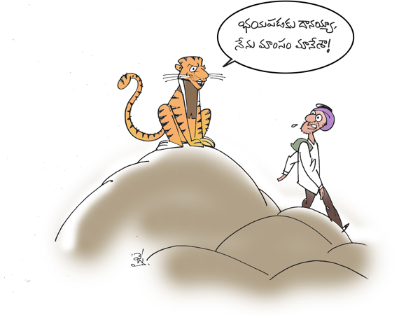 దానయ్యా భయం లేదు. నేను పులినే కానీ యిప్పుడు వెజిటేరియన్ని. చేసిన పాపాలకు ప్రాయశ్చిత్తం చేసుకుంటున్న మంచి టైగర్ని. ఈ బండరాయి మీద మెడిటేషన్ చేసుకుంటూ దారివెంట వచ్చే దానయ్యలకు చేతనైన సాయం చేస్తున్నాను. స్వర్గంలో బెర్తు కోసం కృషి చేస్తున్నాను. నిన్ను చూస్తుంటే రోటీ కపడా మకాన్ లేనివాడివిలా కన్పిస్తున్నావ్. నిన్ను చూస్తుంటే గరీబీ హటావో అమలు చెయ్యాలనిపిస్తుంది. అంటూ పంజాలో గోళ్లు కనిపించకుండా దాచుకుని ధగధగ లాడే బంగారు కంకణాన్ని మాత్రం పైకి పట్టుకుని ఎత్తి చూపింది.