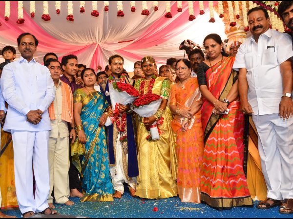 బుధవారం ఉదయం 11.20 గంటలకు హెలికాప్టర్లో సీఎం కేసీఆర్ దంపతులు, నిజామాబాద్ ఎంపీ కవిత హెలికాప్టర్లో మెట్పల్లికి చేరుకున్నారు. వధూవరులు స్వర్ణ, శ్రీకాంత్లను సీఎం దంపతులు ఆశీర్వదించి మంత్రులు, ఎంపీలు, ఎమ్మెల్యేలతో కలిసి అక్కడే భోజనం చేశారు.