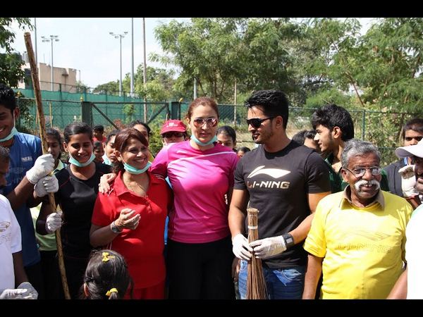 హైదరాబాదులోని లాల్ బహదూర్ స్టేడియంలో చెత్తను సంచులలోకి ఎత్తుతున్న బ్యాడ్మింటన్ క్రీడాకారిణి గుత్తా జ్వాలా. ఆమెతో పాటు పలువురు పాల్గొన్నారు.