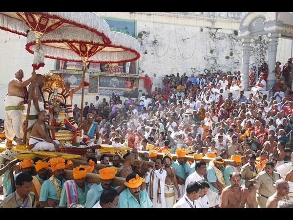 వేలాది మంది భక్తులు స్వామి వారికి హారతలు పట్టారు. ఉదయం 9 గంటల నుంచి 11 గంటల వరక స్వామి వారికి వాహన సేవ జరిగింది. మధ్యాహ్నాం 2 గంటలకు స్నపన తిరుమంజన సేవ జరుగుతుంది. సాయంత్రం 7 గంటలకు స్వామి వారికి వూంజల్ సేవ నిర్వహించారు.