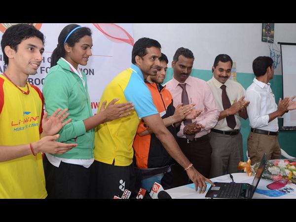 'హృదయ స్పందన ఫౌండేషన్' వెబ్ సైట్ని ప్రారంభిస్తున్న మాజీ బ్యాట్మింటన్ క్రీడాకారుడు పుల్లెల గోపీచంద్. చిత్రంలో కామన్ వెల్త్ గేమ్స్లో బంగారు పతకాన్ని సాధించిన పివి.సింధు, మరో ఆటగాడు పారపల్లి కశ్యప్.