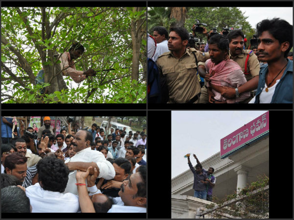 ఇద్దరు కార్యకర్తలు చెట్టుపైకి ఎక్కి, శ్రీశైలంను కిందికి దించారు. మరోపక్క వెంకటేష్ నిద్రమాత్రలు మింగగా పోలీసులు అడ్డుకొని తీసుకెళ్లిపోయారు.