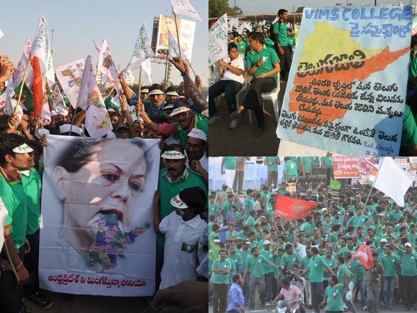 తెలుగుతల్లి వేషంలో యువతి ఇలా కనిపించగా, సమైక్యాంధ్రను కాపాడాలంటూ నినాదాలు చేస్తూ ఇలా.