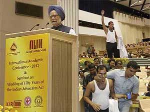 అయితే, దాన్ని ఏ మాత్రం పట్టించుకోకుండా ప్రధాని తన ప్రసంగాన్ని కొనసాగించారు. నిరనస వ్యక్తం చేసిన వ్యక్తిని న్యాయవాదిగా పోలీసులు గుర్తించారు. చిల్లర వర్తంలోకి ప్రత్యక్ష పెట్టుబడులను ఆహ్వానిస్తూ ప్రభుత్వం తీసుకున్న నిర్ణయంపై వ్యతిరేకత వ్యక్తం చేస్తూ ఆ వ్యక్తి నిరసనకు దిగినట్లు తెలుస్తోంది.