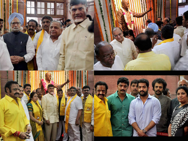 ఎన్టీఆర్ విగ్రహావిష్కరణ కార్యక్రమానికి విచ్చేసిన తెలుగుదేశం పార్టీ అధ్యక్షుడు నారా చంద్రబాబు నాయుడు, హారికృష్ణలతో మిగతా పార్టీ పార్లమెంట్ సభ్యులు.