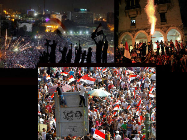 ఈజిప్టు అధ్యక్షుడు మొహమద్ మోర్సీని వ్యతిరేకించేవారు తెహ్రీర్ స్క్రేర్కు పెద్ద యెత్తున చేరి జాతీయ పతాకలను ఎగురవేస్తూ బాణసంచా పేలుస్తూ వెలుగులు నింపారు.