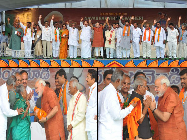 హైదరాబాదులోని ఎల్బీ స్టేడియంలో జరిగిన నవ భారత యువ భేరీ సభకు హాజరైన గుజరాత్ ముఖ్యమంత్రి, బిజెపి ఎన్నికల ప్రచార సారథి నరేంద్ర మోడీ, సీనియర్ నేతలు బండారు దత్తాత్రేయలు అభివాదం చేస్తున్న దృశ్యం. చిత్రంలో బిజెపి రాష్ట్ర అధ్యక్షుడు కిషన్ రెడ్డి, సీనియర్ నేత నాగం జనార్ధన్ రెడ్డి