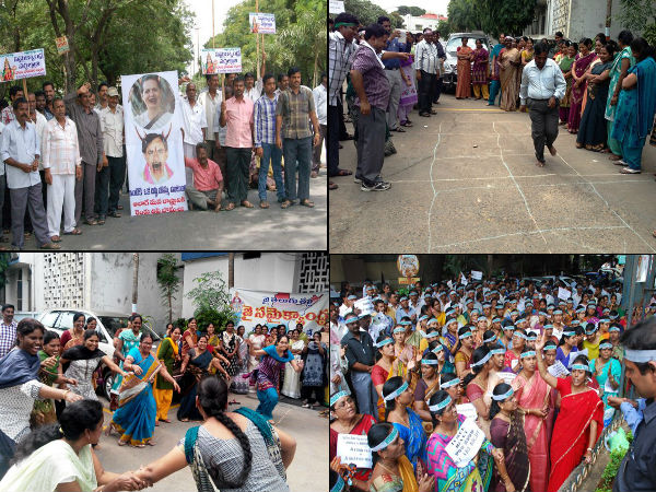 చిత్తూరు జిల్లా తిరుపతిలోని శ్రీ పద్మావతి మహిళా విశ్వవిద్యాలయం ఎదుట రాష్ట్రాన్ని విభజిస్తే దుర్భిక్షం అంటూ నిరసన తెలుపుతున్న దృశ్యం.