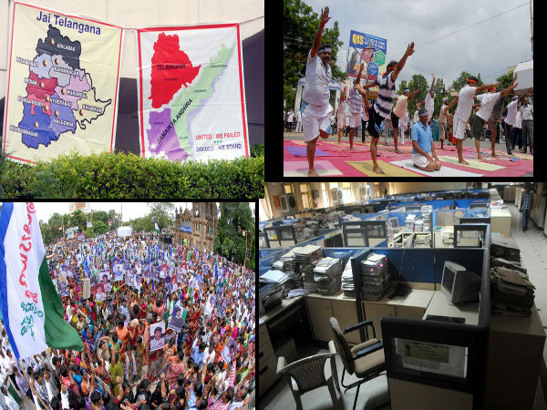 విభజనపై కాంగ్రెసు పార్టీ నిర్ణయాన్ని వ్యతిరేకిస్తూ ప్రకాశం జిల్లా ఒంగోలులో ఆసనాలు చేస్తూ నిరసన తెలుపుతున్న సమైక్యవాదులు.