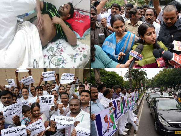 వైయస్సార్ కాంగ్రెసు పార్టీ అధ్యక్షుడు, కడప పార్లమెంటు సభ్యుడు వైయస్ జగన్మోహన్ రెడ్డికి దీక్షకు మద్దతుగా నిమ్స్ ఎదుట రోడ్డు పైన జగన్ ఫోటోలతో కార్యకర్తల నిరసన.