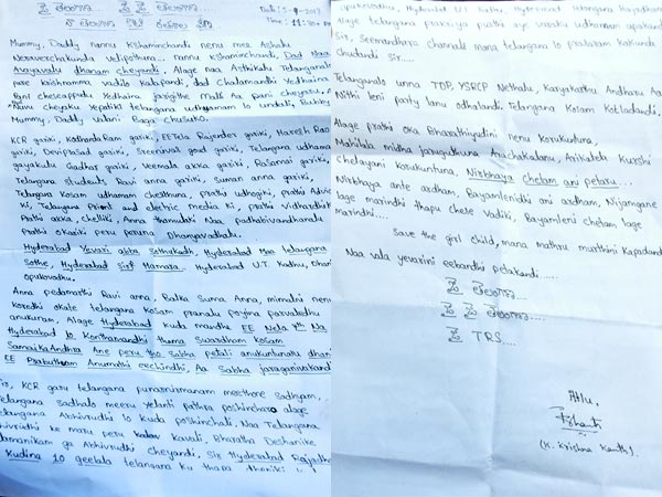 తెలంగాణ రాకుండా సీమాంధ్రులు అడ్డుకుంటున్నారని ఆరోపిస్తూ లేఖ రాసి అతను ఆత్మహత్య చేసుకున్నాడు. రెండు పేజీల సూసైడ్ నోట్ రాసి పెట్టి ఆత్మహత్య చేసుకున్నాడు. 18 ఏళ్ల కృష్ణకాంత్ ఉరివేసుకుని ఆత్మహత్య చేసుకున్నాడు. అతనికి తండ్రి ధనంజయ్, తల్లి హేమలత, ఇద్దరు తమ్ముళ్లు ఉన్నారు. పెద్ద తమ్ముడు చంద్రకాంత్ పదో తరగతి, చిన్న తమ్ముడు రవికాంత్ తొమ్మిదో తరగతి చదువుతున్నారు. కృష్ణకాంత్ మృతదేహానికి తెలంగాణ రాజకీయ జెఎసి చైర్మన్ కోదండరామ్ నివాళులు అర్పించారు.