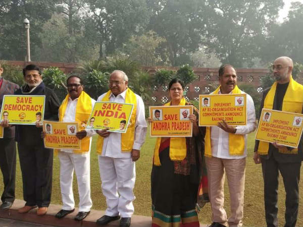 ప్రత్యేక హోదా, విభజన హామీల అమలు డిమాండ్ చేస్తూ టీడీపీ ఎంపీలు సుజనాచౌదరి, అశోక్ గజపతిరాజు, రామ్మోహన్నాయుడు, గల్లా జయదేవ్, మాల్యాద్రి శ్రీరాం, మాగంటి బాబు, నిమ్మల కిష్టప్ప, కనకమేడల రవీంద్ర కుమార్, తోట సీతారామలక్ష్మి, అవంతి శ్రీనివాస్, టీజీ వెంకటేశ్, మురళీ మోహన్, కేశినేని నాని, కొనకళ్ల నారాయణరావు, కర్నూలు ఎంపీ బుట్టా రేణుక, మాజీ ఎంపీ కంభంపాటి రామ్మోహన్ రావులు పార్లమెంటు ప్రాంగణంలోని గాంధీ విగ్రహం వద్ద బుధవారం, గురువారం కూడా నిరసన తెలిపారు.