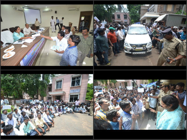 ఏపి మంత్రి ఎదుట ఔట్ సోర్సింగ్ స్టాఫ్ ధర్నా(పిక్చర్స్)