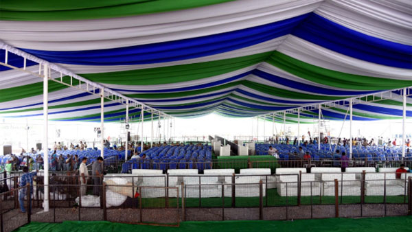 రాష్ట్ర నూతన మంత్రివర్గ ప్రమాణ స్వీకారం కోసం వెలగపూడి సచివాలయం సమీపంలో అన్ని ఏర్పాట్లు పూర్తయ్యాయి. ఉదయం 11.45 గంటలకు గవర్నర్ నరసింహన్ ప్రాంగణానికి చేరుకుంటారు. ఆయనకు ముఖ్యమంత్రి జగన్ స్వాగతం పలుకుతారు. సరిగ్గా 11.49 గంటలకు మంత్రులతో గవర్నర్ ప్రమాణ స్వీకారం చేయిస్తారు. సాధారణ పరిపాలనా అధికా రులతో పాటుగా పార్టీ నేతలు ఇప్పటికే అన్ని ఏర్పాట్లు పూర్తి చేసారు. కార్యక్రమానికి వచ్చే అతిధుల కోసం ప్రొటోకాల్ విభాగం ప్రత్యేక ఏర్పాట్లు చేసింది. కార్యక్రమాన్ని ప్రతి ఒక్కరూ తిలకించేందుకు వీలుగా ప్రాంగణంలో ఎల్ఇడి తెరలను ఏర్పాటుచేశారు. 1500 మంది పోలీసులతో ప్రభుత్వం బందోబస్తు ఏర్పాటుచేసింది. సచివాలయం వైపు వెళ్లే రహదారుల్లో ట్రాఫిక్ అంతరాయం లేకుండా పోలీసులు ముందస్తు జాగ్రత్తలు తీసుకున్నారు. కాగా, ఆహ్వాన పత్రికలకు వెనుక భాగాన రూట్ మ్యాప్ను కూడా ముద్రించారు. ఇక, ఈ ప్రాంగణంలో ప్రస్తుతం భారీ వర్షం కురుస్తోంది.