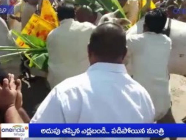 విశాఖపట్నం: జిల్లాలో ఆదివారం జరిగిన జనచైతన్య యాత్రలో మంత్రి అయ్యన్నపాత్రుడు ఎడ్ల బండిపై నుంచి జారి పడబోయారు. వెంటనే అప్రమత్తమైన భద్రతా సిబ్బంది ఆయన కింద పడిపోకుండా పట్టుకున్నారు. అనకాపల్లి అసెంబ్లీ నియోజకవర్గం పరిధిలోని తుమ్మపాల పంచాయతీలో నిర్వహించిన తెలుగుదేశం పార్టీ జనచైతన్య యాత్రలో ఈ ఘటన జరిగింది. యాత్రలో డప్పుల చప్పుడుకు గిత్తల బెదరడంతో ఎడ్లబండి అదుపుతప్పింది. దీంతో ఒక్కసారిగా బండి కిందకు ఒరిగింది. వెంటనే మంత్రి పక్కేనే ఉన్న, నాయకులు, కార్కకర్తలు భద్రతా సిబ్బంది అప్రమత్తమయ్యారు. ఈ ఘటనలో మంత్రికి ఎటువంటి గాయాలు కాలేదు. దీంతో అందరూ ఉపిరిపీల్చుకున్నారు. అనంతరం మంత్రి పార్టీ కార్యక్రమాల్లో చురుకుగా పాల్గొన్నారు.
