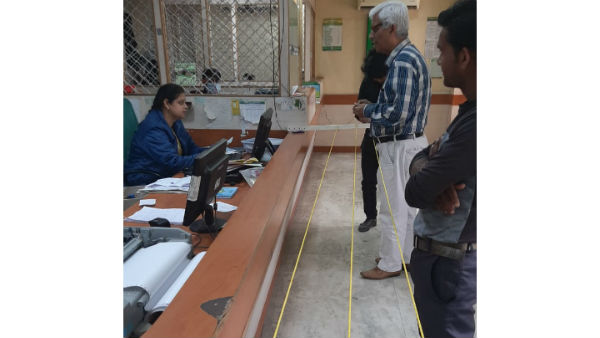 బ్యాంకు ఉద్యోగుల ముందుచూపునకు సలాం: కౌంటర్ల వద్దకు రాకూండా..తాడు కట్టి మరీ..!