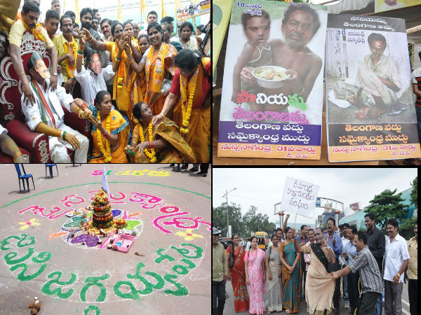 తెలంగాణ రాష్ట్ర సమితి అధ్యక్షుడు కల్వకుంట్ల చంద్రశేఖర రావును సమైక్యవాదులు భిక్షగాడి రూపంలో చిత్రీకరించి నిరసన తెలిపారు. సోనియమ్మ తెలంగాణమ్మ అంటూ... కెటిఆర్ను ఎత్తుకొని, 10 జనపథ్ వద్ద కూర్చున్నట్లుగా చిత్రీకరించారు.