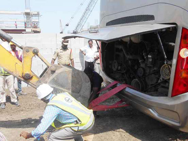 గమ్యానికి సుమారు 100 అడుగుల దూరంలో బస్సు కూరుకుపోవడంతో సీఎం చంద్రబాబుతో పాటు మంత్రి నారాయణ, అధికారులు బస్సు దిగి నడుచుకుంటూ సచివాలయ బ్లాక్ వద్దకు వెళ్లారు. బస్సును వెనుక భాగంలో క్రేన్ ద్వారా బెల్ట్ కట్టి లాగినప్పటికీ బస్సు మొరాయించింది.