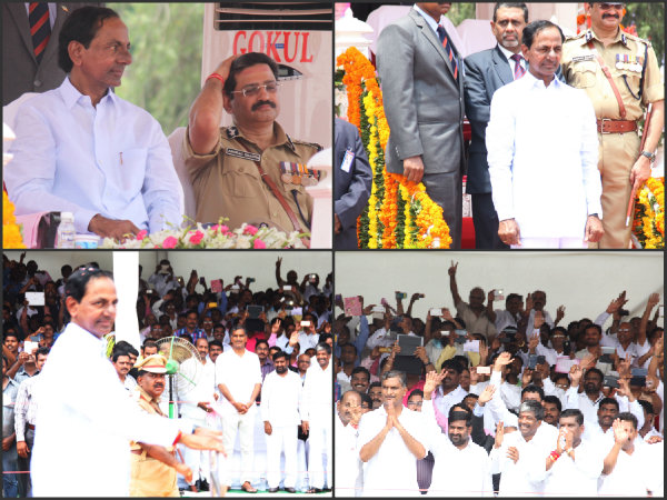తెలంగాణ తొలి ముఖ్యమంత్రి కల్వకుంట్ల చంద్రశేఖర రావు సోమవారం ఉదయం పరేడ్ మైదానంలో జరిగిన తెలంగాణ ఆవిర్భావ వేడుకల్లో పాల్గొన్నారు. పోలీసుల గౌరవ వందనం.
