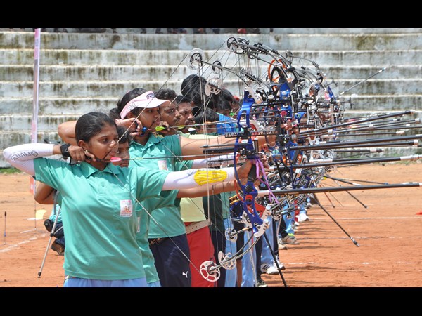 విల్లంబులు ఎక్కు పెట్టిన పురుషులు. పురుషుల విభాగంలో అనంతపురం, ప్రకాశం, చిత్తూరు జిల్లాలు మినహా మిగిలిన జిల్లాల నుంచి ఆర్చర్లు పాల్గొన్నారు.