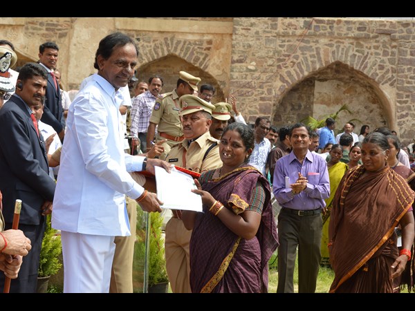 హైదరాబాదులోని గోల్కొండ కోటలో జాతీయ పతాకను ఆవిష్కరించిన తర్వాత కెసిఆర్ దళితులకు భూమి పట్టాలు అందజేశారు. ఒక్కో జిల్లా నునంచి ఇద్దరేసి లబ్ధిదారులను ఎంపిక చేసి ఆయన పట్టాలు అందజేశారు.