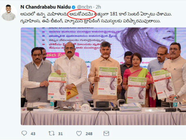తాజాగా ఏపీ సీఎం చంద్రబాబు నాయుడు కూడా తప్పులో కాలేశారు. మహిళా రక్షణ కోసం ఏర్పాటు చేసిన కాల్ సెంటర్ గురించి తన ట్విట్టర్ ఖాతాలో పోస్టు చేశారు. అందులో ఆపదలో ఉన్న మహిళలను ఆడుకోవడమే లక్ష్యంగా 181 కాల్ సెంటర్ ఏర్పాటు చేశాము. గృహహింస, ఈవ్ టీజింగ్, హ్యూమన్ ట్రాఫికింగ్ సమస్యలకు పరిష్కారమవుతాయ'ని ట్వీట్ చేశారు. ఆదుకోవడమే అని కాకుండా ఆడుకోవడమే అని పేర్కొనడం విమర్శలకు తావిచ్చేదిగా మారింది.