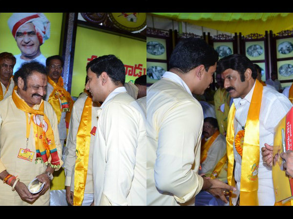 హైదరాబాదులోని గండిపేటలో బుధవారం తెలుగుదేశం పార్టీ పండుగ అయిన మహానాడు ప్రారంభమైంది. హరికృష్ణకు లోకేష్ పలకరింపు. నవ్వుతూ హరికృష్ణ, యువనేత లోకేష్.