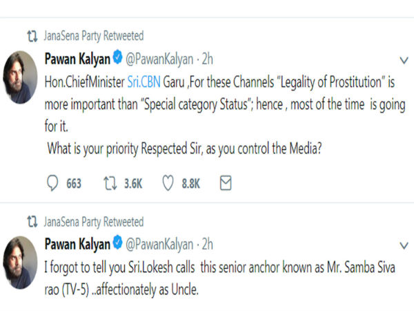 అంతేకాదు ఈ ఉదంతానికి సంబంధించి చంద్రబాబు, లోకేష్, మీడియా సంస్థలపై పవన్ కళ్యాణ్ ఆరోపణలు, విమర్శలు చేశారు. చంద్రబాబు నుద్దేశించి మాట్లాడుతూ ప్రత్యేక హోదా కంటే చట్టబద్దంగా వ్యభిచారం చేస్తున్న మీడియాలను నియంత్రించడం ముఖ్యమన్నారు.