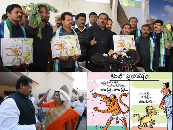 కాగా, ముఖ్యమంత్రి కిరణ్ కుమార్ రెడ్డి సమైక్యవాదంపై పైకి పులిలా ఉంటూ సోనియా గాంధీ ముందు పిల్లిలా మారిపోతున్నారంటూ వైయస్సార్ కాంగ్రెసు పార్టీ ఎమ్మెల్యే భూమన కరుణాకర్ రెడ్డి కార్టూన్ ప్రదర్శించారు. మరోవైపు రెండు రోజుల క్రితం తోపులాటలో కిందపడిన నన్నపనేని రాజకుమారి, అందుకు కారకులైన స్వామిగౌడ్లు ఈ రోజు చక్కగా మాట్లాడుకున్నారు.