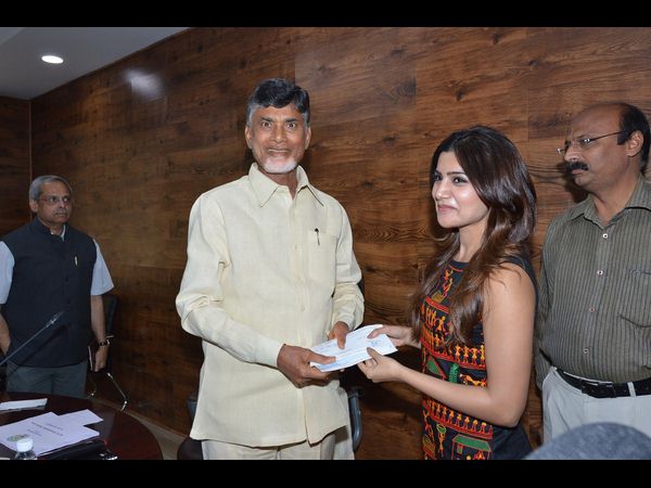 టాలీవుడ్ స్టార్ హీరోయిన్ సమంత ఆంధ్రప్రదేశ్ ముఖ్యమంత్రి నారా చంద్రబాబు నాయుడును శనివారం మధ్యాహ్నం కలిసి, రూ.10 లక్షల చెక్కును అందజేశారు.