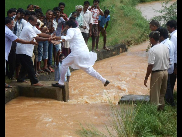కేంద్రమంత్రి చిరంజీవి సోమవారం విశాఖపట్నం, తూర్పు గోదావరి జిల్లాల్లో వర్ష ప్రభావిత ప్రాంతాలలో పర్యటించి బాధితులను పరామర్శించారు. ఈ సమయంలో కాలువ దాటేందుకు గంతు వేస్తున్న దృశ్యం.