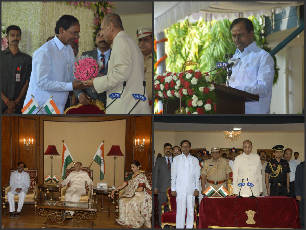 గవర్నర్ నరసింహన్ తెలంగాణ తొలి ముఖ్యమంత్రిగా కెసిఆర్తో సోమవారం ఉదయం ప్రమాణం చేయించారు.