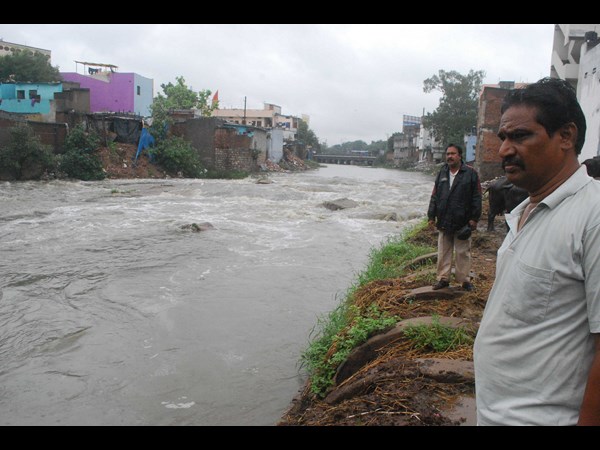 హైదరాబాదులో ఐదు రోజులుగా కురుస్తున్న వర్షాలతో నగరం తడిసి ముద్దయింది. నగరంలో మురికి నీరు ప్రవహించే మూసీ నది జోరుగా పారుతోంది. చూస్తున్న ప్రజలు.