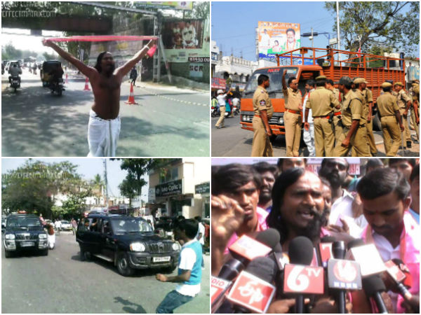 వైయస్సార్ కాంగ్రెసు పార్టీ అధ్యక్షుడు వైయస్ జగన్మోహన్ రెడ్డి కాన్వాయ్ వస్తుండగా అడ్డుకునేందుకు ఎదురుగా వెళ్తున్న ఓ తెలంగాణవాది.