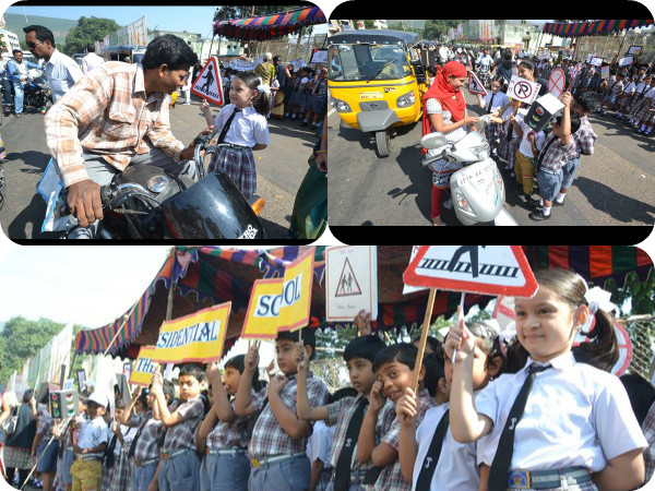 చిన్నారులు ట్రాఫిక్ నిబంధనలకు సంబంధించిన ప్లకార్డులను పట్టుకొని రోడ్డు మీద వెళ్తున్న ప్రయాణీకులకు ట్రాఫిక్ సమస్య పైన అవగాహన కల్పించారు.
