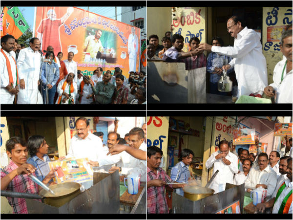 వెంకయ్య నాయుడు బుధవారం విజయవాడలో టీ స్టాల్ ప్రారంభించి, టీ చప్పరించి, ఎన్నికల ప్రచారానికి శ్రీకారం చుట్టారు.