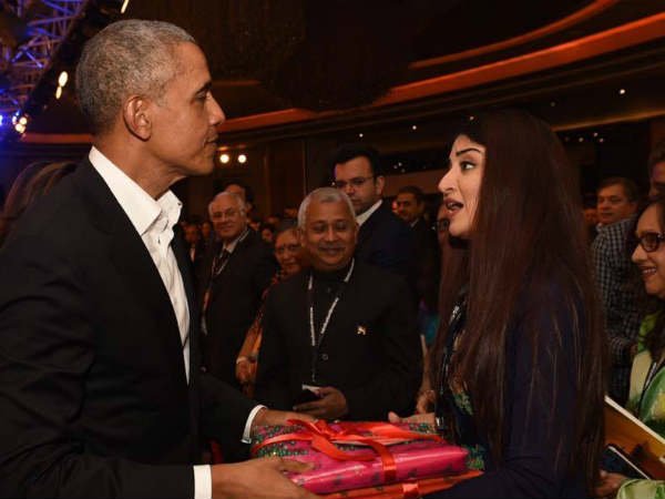 ఈ సందర్భంగా పూనమ్.. బరాక్ ఒబామాను కలిసి చేనేత వస్త్రాలను బహుమతిగా అందించారు. ఈ సందర్భంగా తీసిన ఫొటోలను పూనమ్ తన ట్విట్టర్, ఫేస్బుక్ ఖాతాల్లో పోస్ట్ చేశారు.