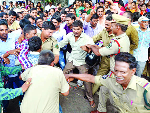 వారిలో ఒకరిద్దరిని లాగి అరెస్టు చేసేందుకు పోలీసులు ప్రయత్నించి బెదరకుండా వేలాదిమంది ఉపాధ్యాయులు ముందుకు దూసుకుపోయారు. కలెక్టరేట్ గేట్లు ఎక్కి మరీ కొందరు లోనికి దూకారు. పోలీసులు బలవంతంగా వారిని బయటకు పంపే ప్రయత్నం చేశారు. కలెక్టరేట్ బయట మరికొందరు ఉపాధ్యాయులు రోడ్డుపై మధ్యాహ్నం వరకూ బైఠాయించి ధర్నా చేశారు. ఈ సందర్భంగా ఫ్యాప్టో నాయకులు, యుటిఎఫ్ రాష్ట్ర అధ్యక్షులు షేక్ సాబ్జీ మాట్లాడుతూ సిపిఎస్ రద్దుకు అన్ని పార్టీలూ మద్దతిచ్చాయన్నారు. బిజెపి, టిడిపి మాత్రం సిపిఎస్ విధానాన్ని రద్దు చేసేందుకు ముందుకు రావడం లేదని విమర్శించారు.