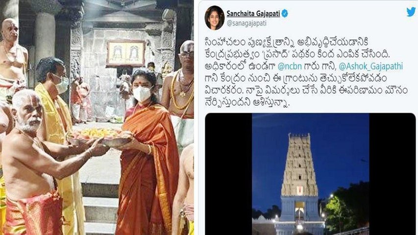 సింహాచల దేవస్థాన చైర్మన్ సంచయిత గజపతిరాజు మరోసారి తన చిన్నాన్న అశోక గజపతిరాజు, మాజీ సీఎం చంద్రబాబు నాయుడుపై ఫైరయ్యారు. సింహాచల అప్పన్న ఆలయాన్ని కేంద్ర ప్రభుత్వం 'ప్రసాద్' పథకంలో చేర్చిన విషయాన్ని వీడియో ట్వీట్ చేశారు. తనకు ఇప్పుడు సంతోషంగా ఉంది అని.. గత ప్రభుత్వ హయాంలో ఎందుకు చేయలేదు అని ఆమె ప్రశ్నించారు. తనపై లేని పోని ఆరోపణలు చేసిన వారికి తనది ఒక్కటే సమాధానం అని.. కష్టపడి పనిచేసి ఆలయాన్ని ప్రపంచస్థాయిలో నిలబెడతానని చెప్పారు.