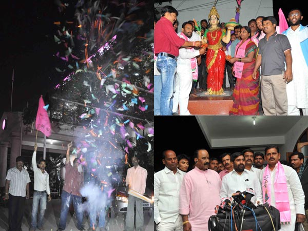తెలంగాణ భవన్లో ఆ పార్టీ నాయకులు సంబరాలు చేసుకున్నారు. పార్టీ అధ్యక్షుడు కల్వకుంట్ల చంద్రశేఖర రావు ఇంటికి వెళ్లి శుభాకాంక్షలు తెలిపారు.