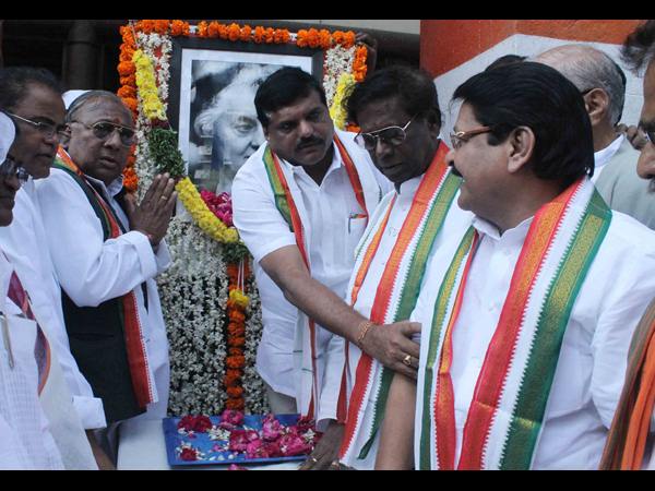 దివంగత ఇందిరా గాంధీ జయంతి సందర్భంగా గాంధీ భవన్లో ఆమె చిత్ర పటానికి నివాళులు అర్పిస్తున్న బొత్స, సర్వే, దానం నాగేందర్ తదితరులు.