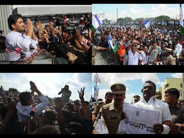 కాగా, తెలంగాణవాదులు తెలంగాణ ప్లకార్డు ప్రదర్సిస్తూ నిరసన వ్యక్తం చేశారు. వారిని పోలీసులు అడ్డుకున్నారు. జగన్ విడుదల సమైక్యాంధ్ర ఉద్యమానికి ఊపు వస్తుందని భావిస్తున్నారు. సమైక్యాంధ్ర కోసం ఆయన పోరాటం చేస్తారని వైయస్సార్ కాంగ్రెసు పార్టీ నాయకులు, కార్యకర్తలు భావిస్తున్నారు.