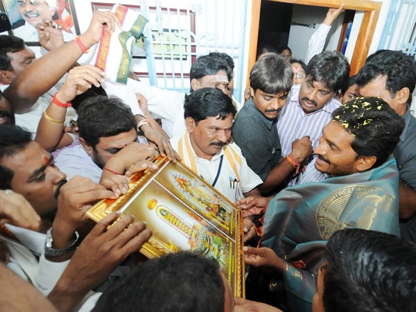 వైయస్ జగన్మోహన్ రెడ్డి చేపట్టిన సమైక్య శంఖారావం, ఓదార్పు యాత్ర పదో రోజుకు చేరుకుంది. ఆయన చిత్తూరు జిల్లాలోని శ్రీకాళహస్తి, చంద్రగిరి నియోజకవర్గాల్లో ఈ యాత్రను నిర్వహించారు. శ్రీకాళహస్తికి చేరుకున్న జగన్మోహన్ రెడ్డికి మల్లిఖార్జున స్వాముల వారి చిత్రపటాన్ని బహూకరిస్తున్న కార్యకర్తలు.