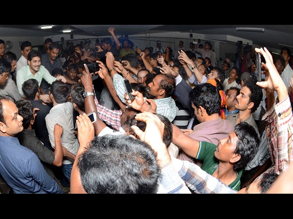 హైదరాబాదులోని లోటస్ పాండు వద్ద పార్టీ అధ్యక్షుడు వైయస్ జగన్మోహన్ రెడ్డితో కరచాలనం చేసేందుకు ఎగబడుతున్న వైయస్సార్ కాంగ్రెసు పార్టీ కార్యకర్తలు.