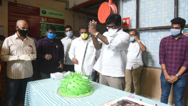 కరోనా విలయం:బాహుబలి కత్తే ఆయుధం.. వైరస్ కేక్తో మంత్రి బర్త్డే వేడుకలు..