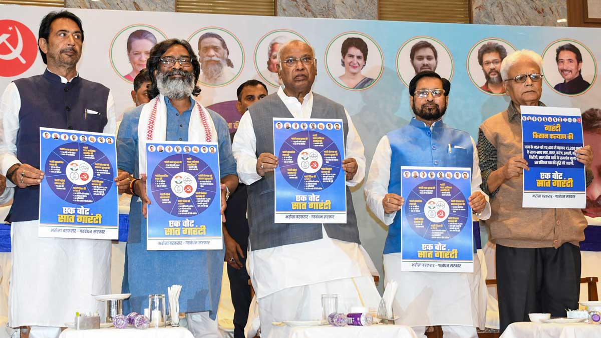 ఇండియా బ్లాక్ '7 గ్యారెంటీస్' పేరుతో జార్ఖండ్ ఎన్నికల మేనిఫెస్టోను విడుదల చేసింది. కాంగ్రెస్ పార్టీ అధ్యక్షుడు మల్లికార్జున ఖర్గే, జార్ఖండ్ సీఎం హేమంత్ సోరెన్, ఆర్జేడీ పార్టీ నేత జేపీ యాదవ్ ఉమ్మడిగా ఈ మేనిఫెస్టోను విడుదల చేశారు. జార్ఖండ్ అసెంబ్లీ ఎన్నికల్లో జేఎంఎం, కాంగ్రెస్, ఆర్జేడీ కలిసి పోటీ చేస్తున్న విషయం తెలిసిందే.